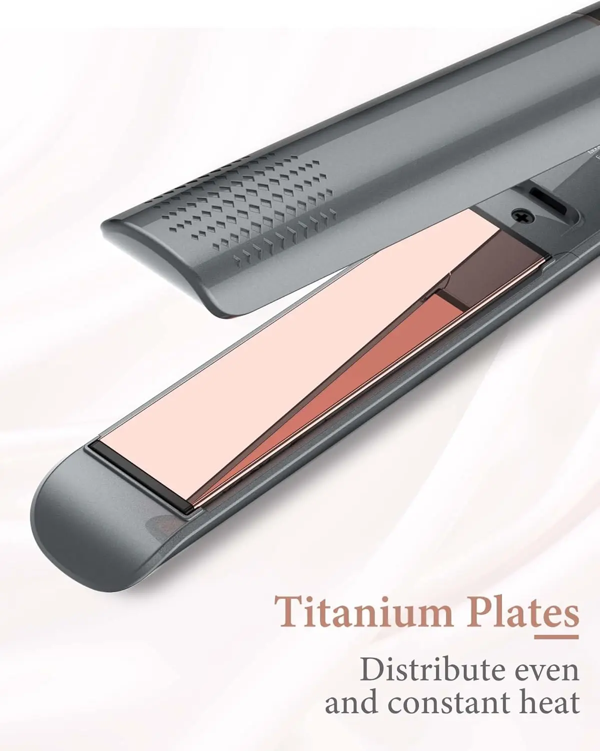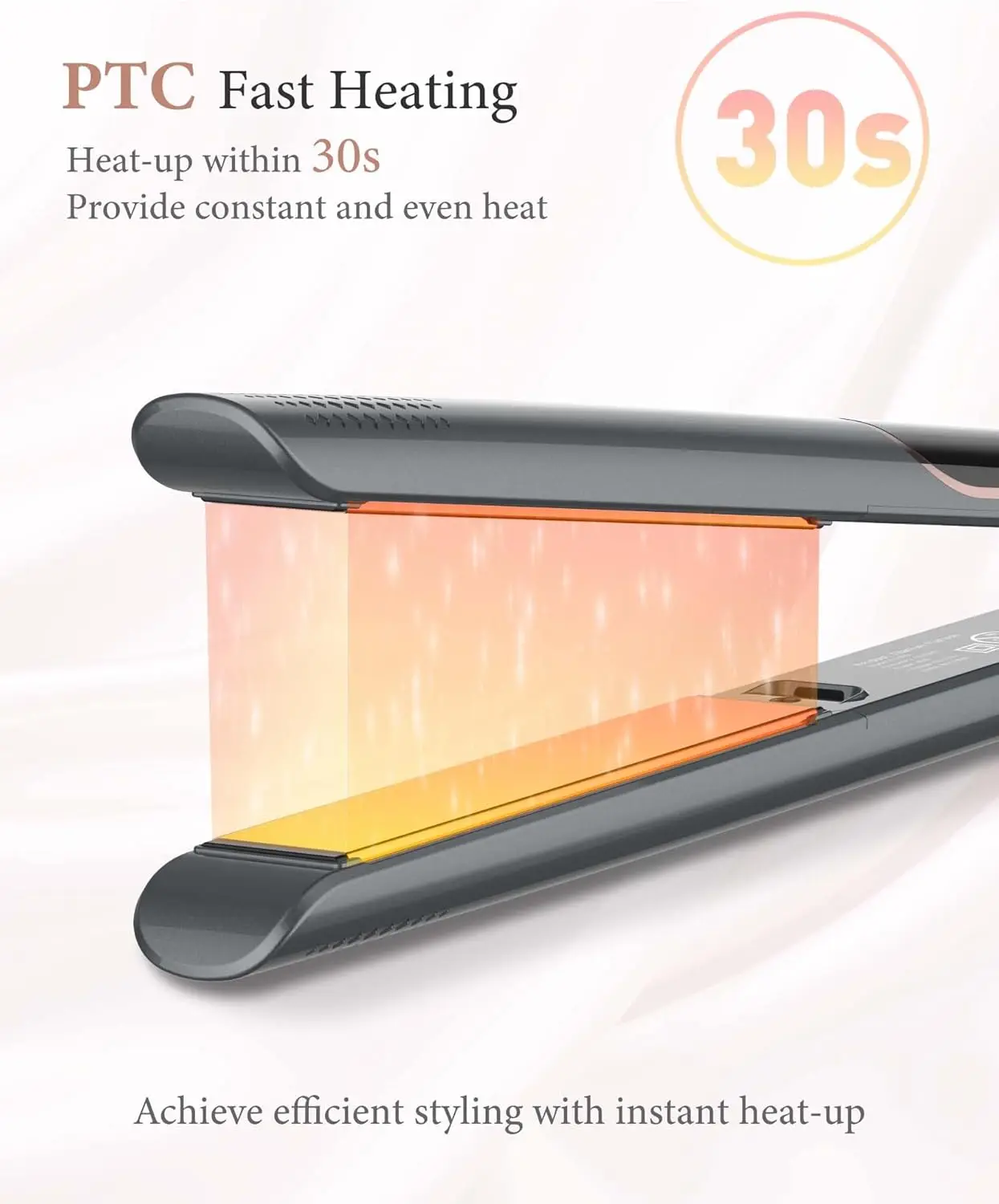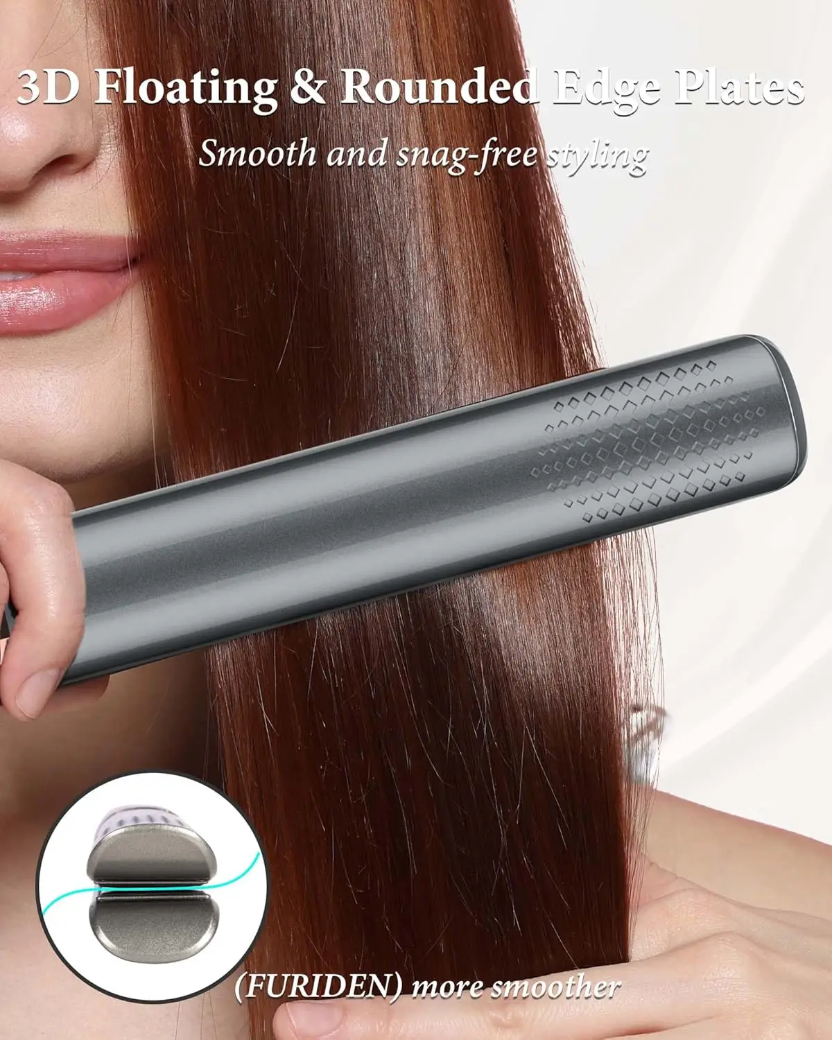 This versatile hair styling tool combines a straightener and curler in one, perfect for creating sleek or wavy looks. Key features include: – **3D Floating Plates**: These plates adjust to the shape of your hair strands, ensuring even heat distribution and reducing damage by minimizing tugging and snagging. – **Negative Ion Technology**: Emits negative ions during use to help seal hair cuticles, lock in moisture, reduce frizz, and leave your hair looking shiny and smooth. – **Double Voltage Compatibility**: Works with both 110V and 220V systems, making it ideal for travel or use in different countries without needing a converter. – **1-Inch Plate Width**: The wider plate design allows for faster styling on longer or thicker hair sections, saving time while achieving professional results. – **Versatile Styling Functions**: Easily switch between straightening for a sleek finish and curling for soft waves or defined curls with adjustable temperature settings to suit various hair types. Designed for durability and ease of use, this tool heats up quickly with consistent performance. It’s suitable for all hair textures from fine to coarse. Use it at home to achieve salon-quality styles effortlessly. Regular maintenance tips: clean plates after use and store in a dry place to prolong lifespan.