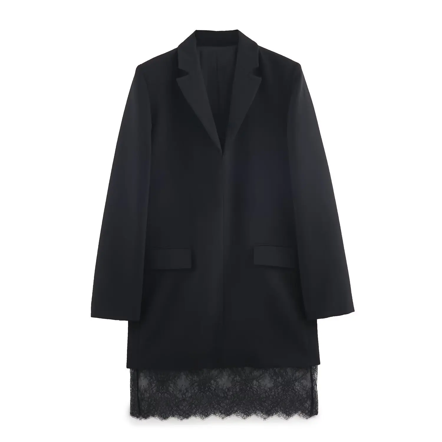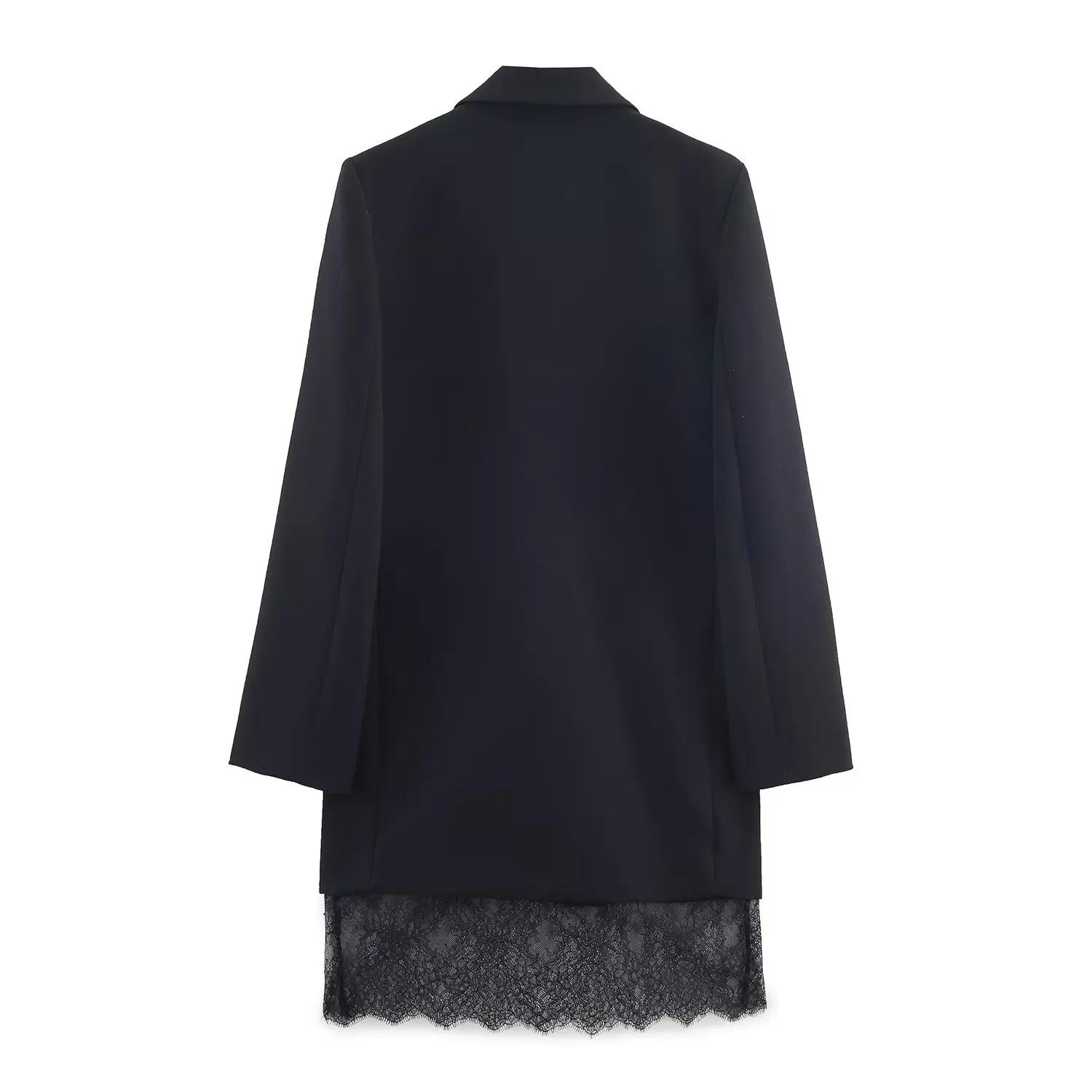 2026 New Women Black Lace-trim Blazer Dress Fashion Notched Long Sleeve Pullover Chic Dress Elegant Office Lady Pockets Dress