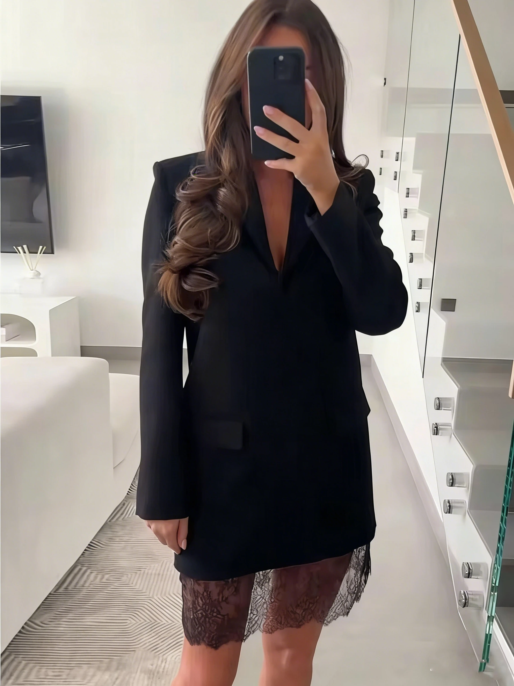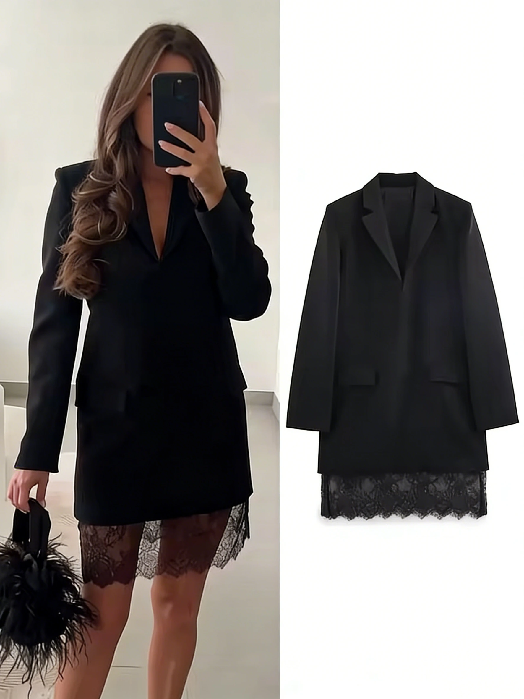 / 2026 New Women Black Lace-trim Blazer Dress Fashion Notched Long Sleeve Pullover Chic Dress Elegant Office Lady Pockets Dress
