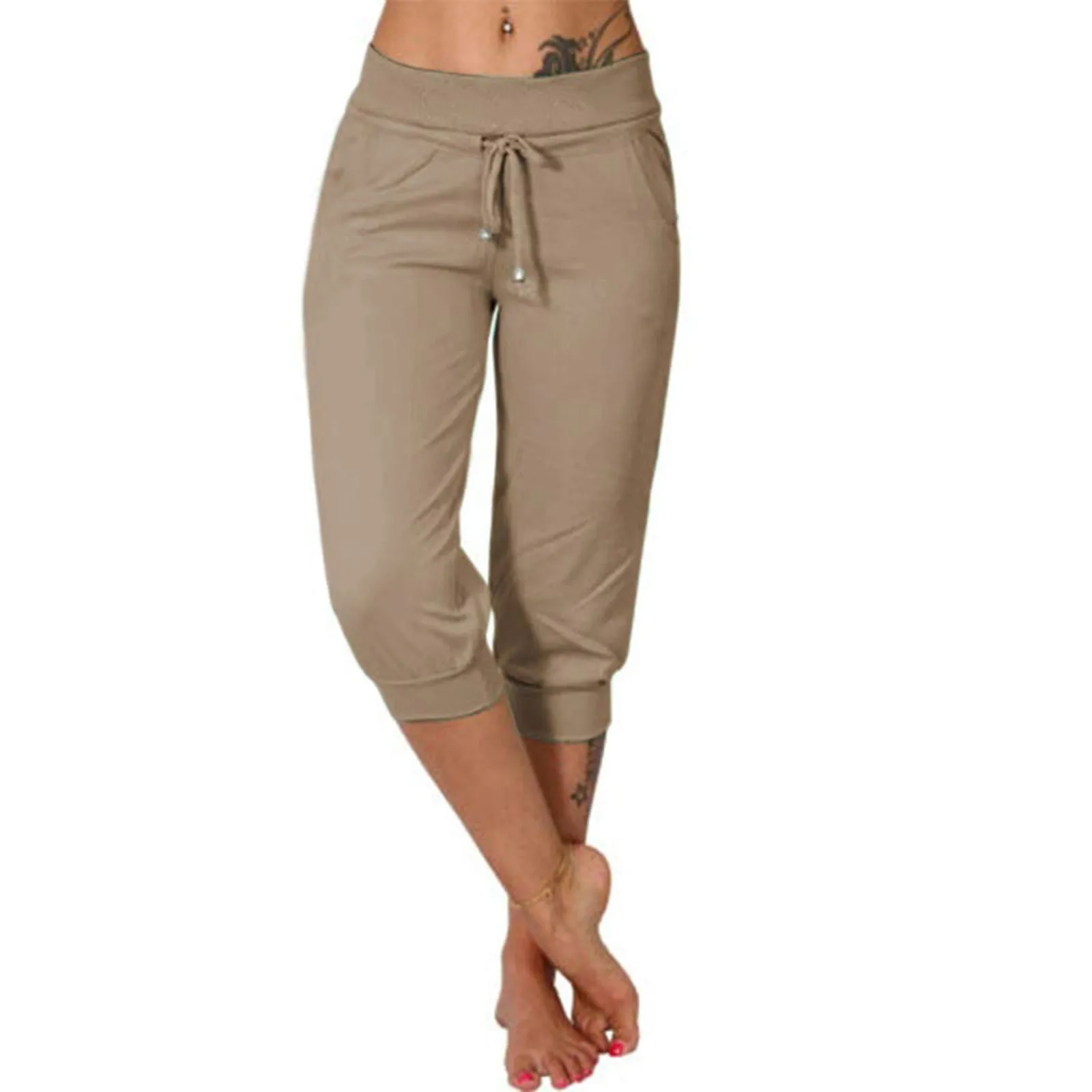 Classic Solid Color Jogging Pants Women Cotton Linen Capris Trousers Bandage Double Pocket Pants Summer Beach Vacation Wear