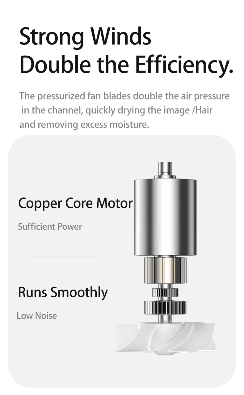Copper core motor + pressurized fan blades double air pressure — dries hair/paint efficiently, removes excess moisture; low-noise operation for quiet use.