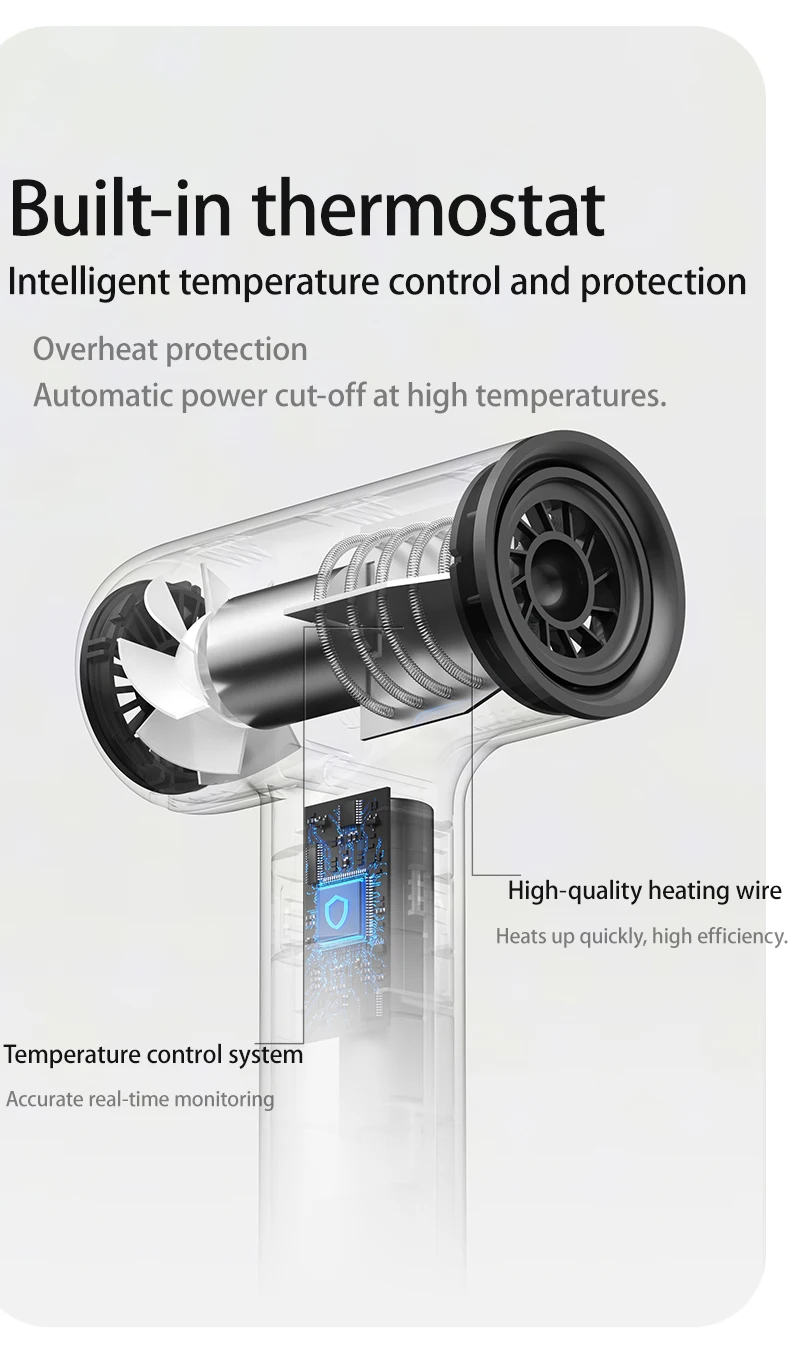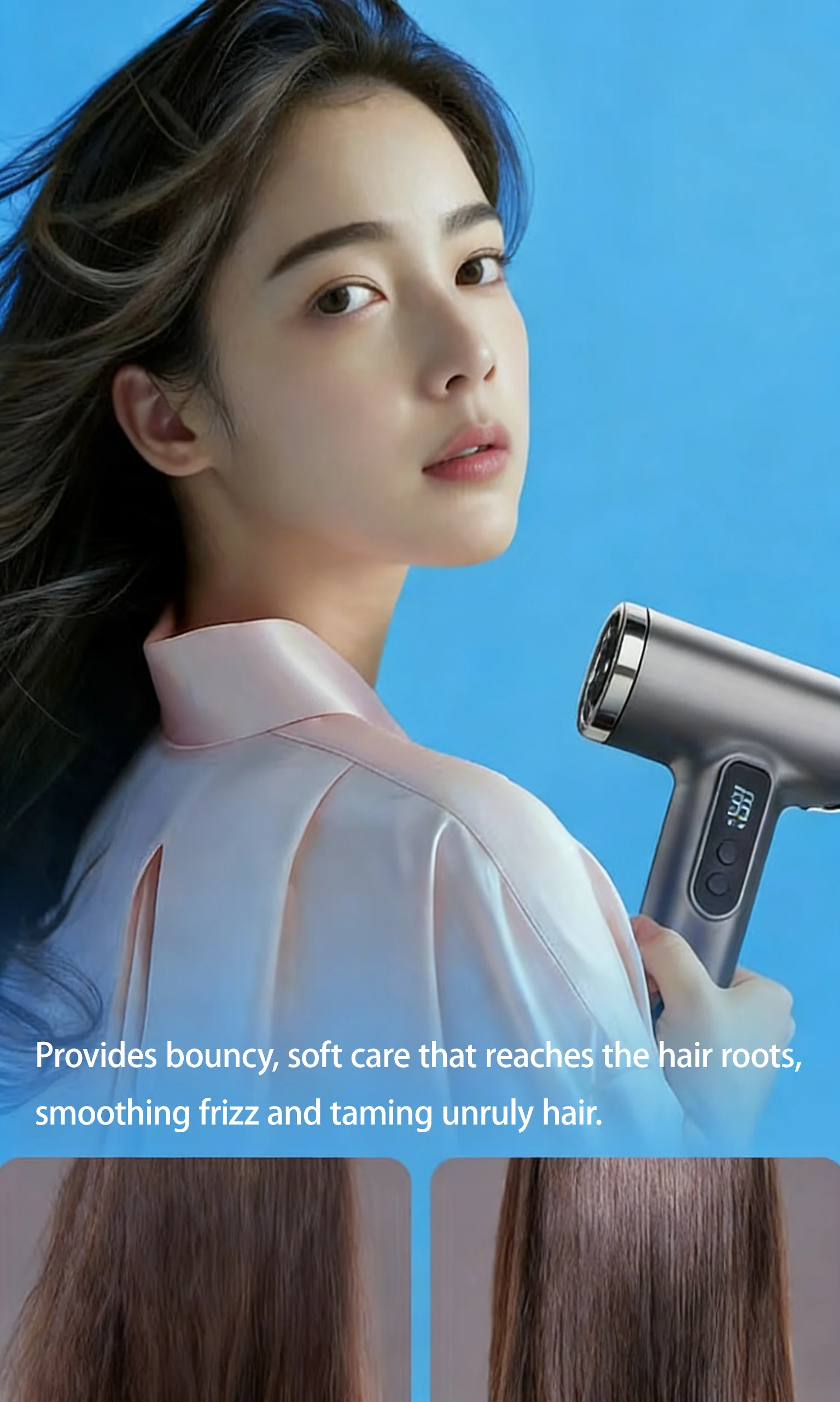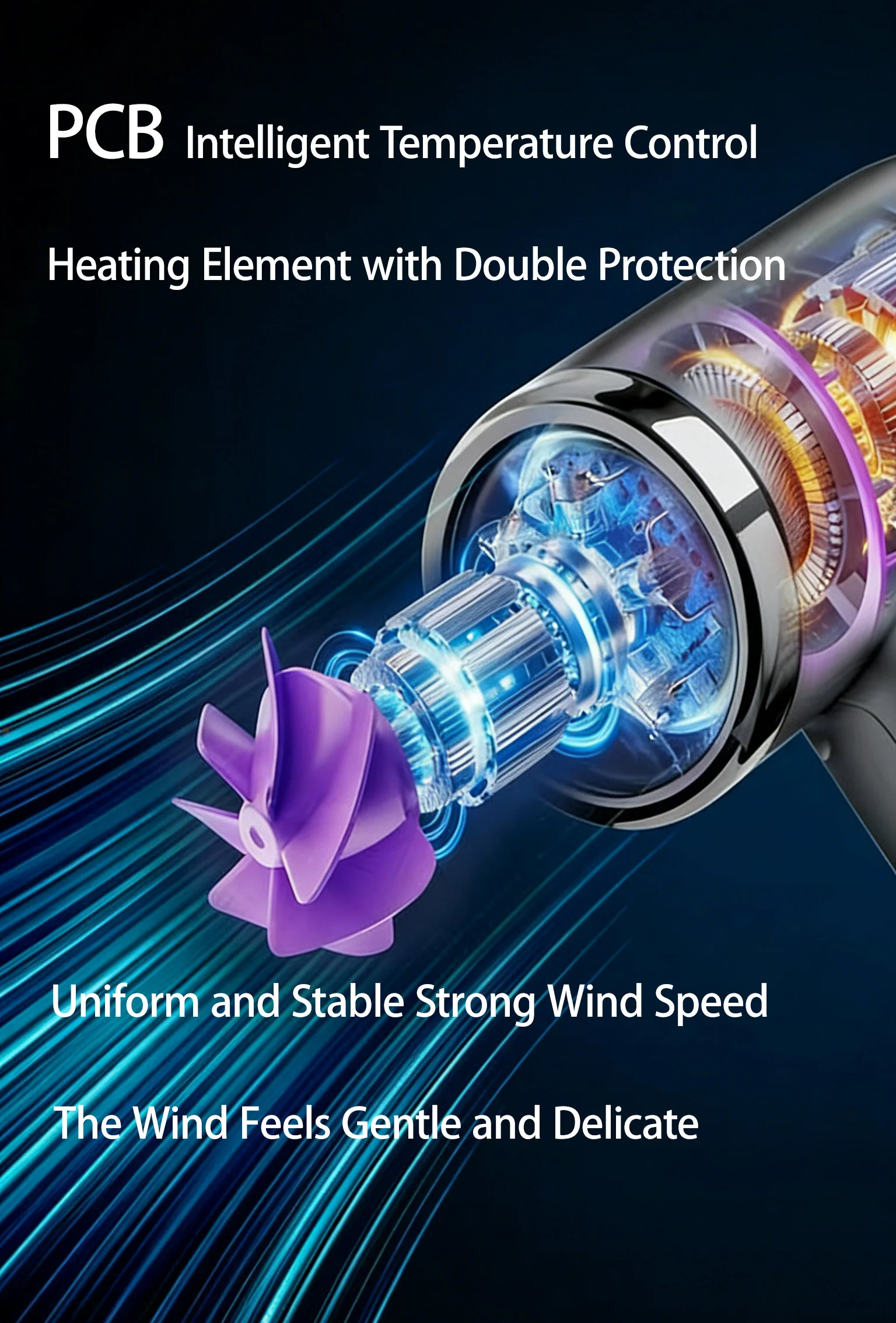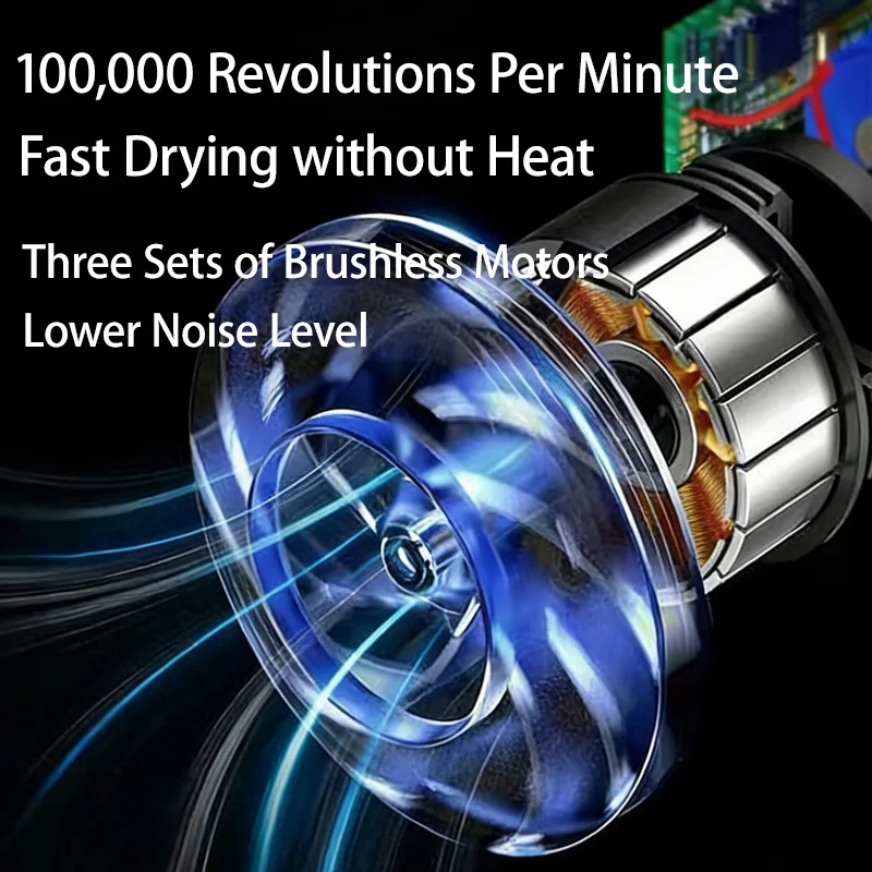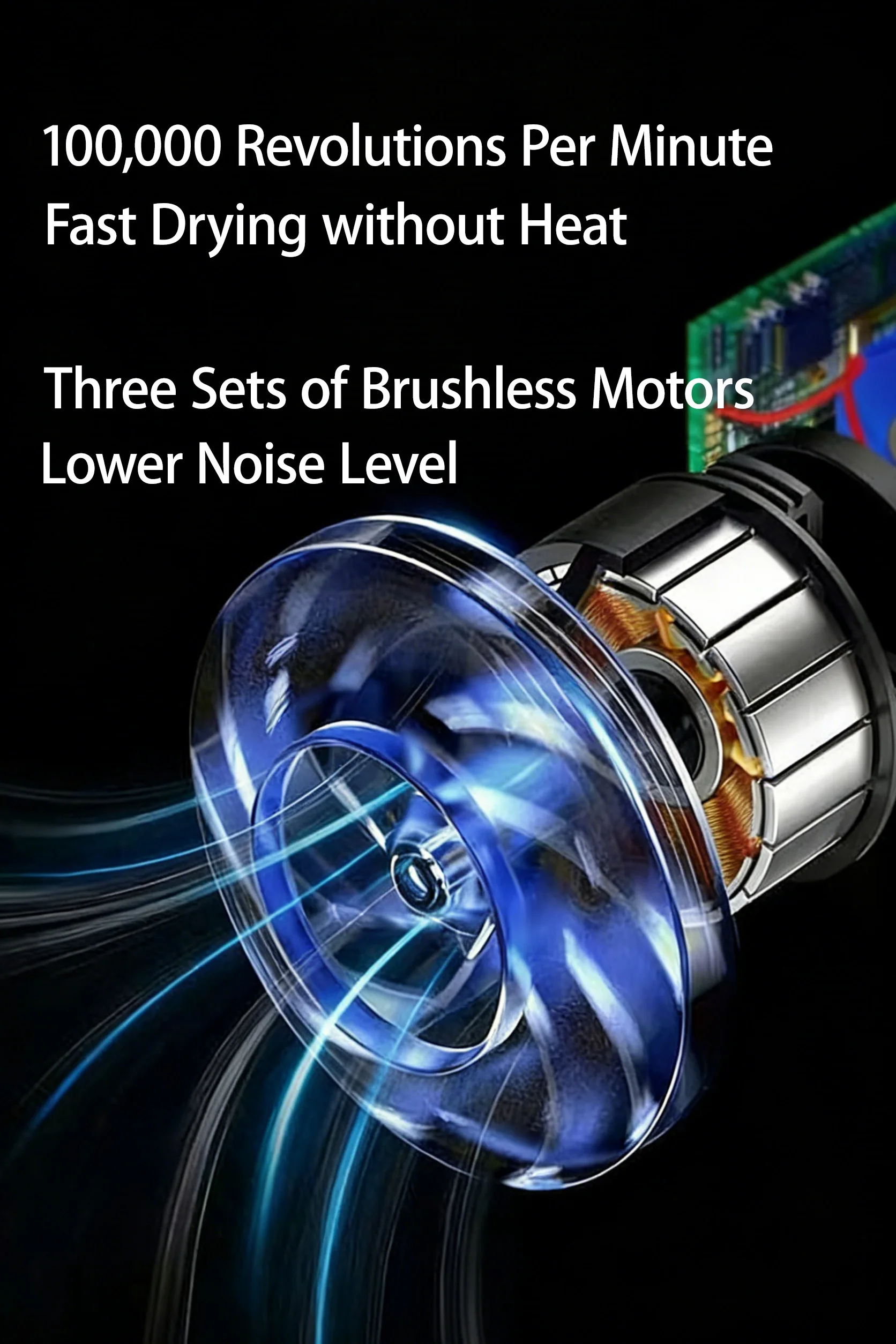 100,000 RPM brushless motors (3 sets) enable fast drying without overheating; PCB intelligent temperature control + double-protection heating element ensure safe, stable airflow (gentle yet powerful to smooth frizz/tameunruly hair).