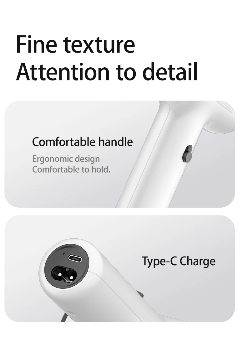 Comfortable ergonomic handle; Type-C charging port for convenient recharging; available in white/black sleek finishes.