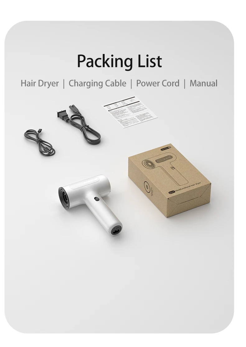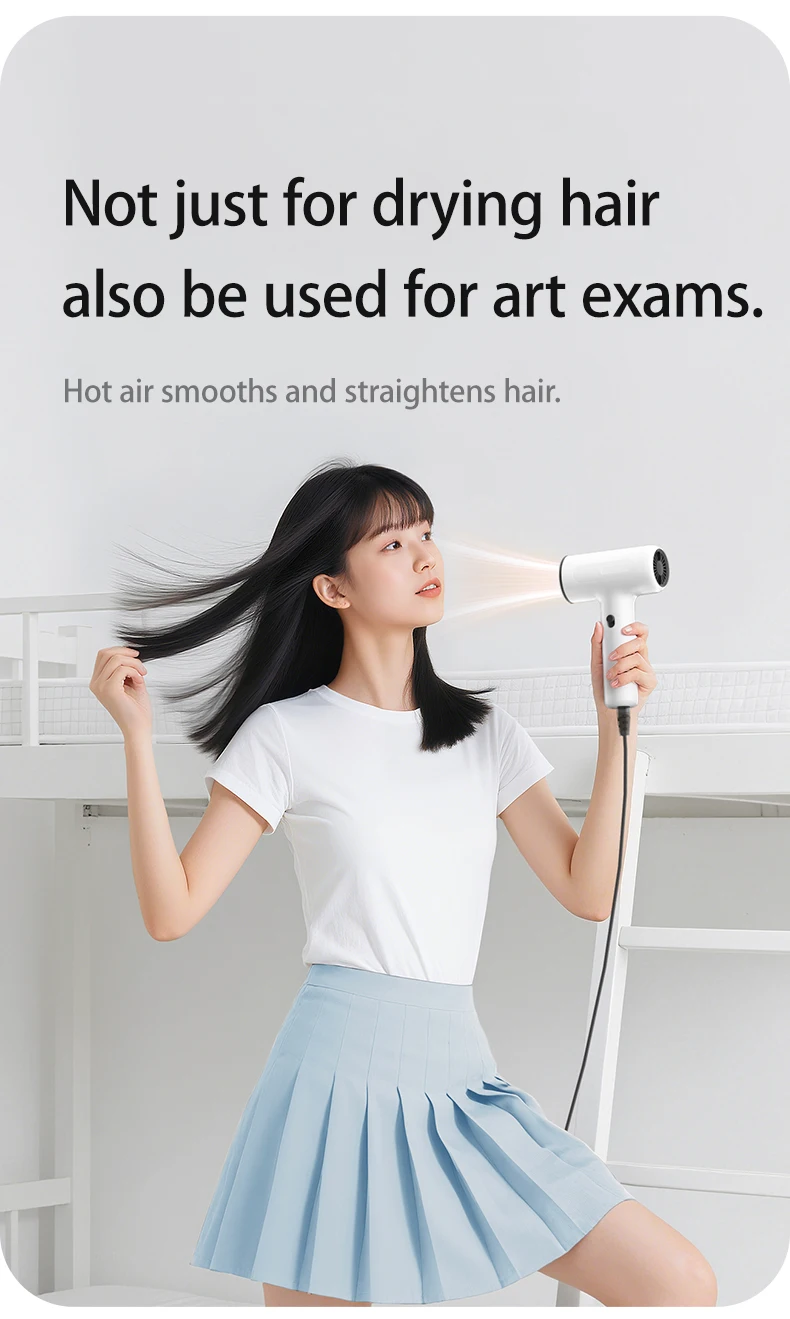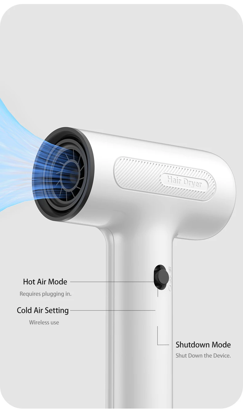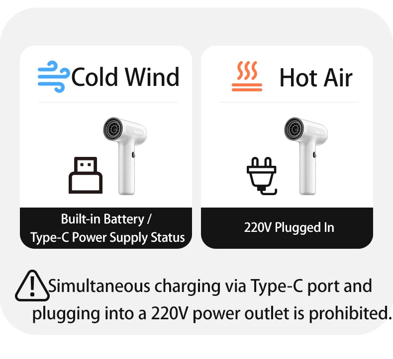 Hot Air (220V): 500W high power heats up quickly, delivering strong airflow for fast hair drying (note: do NOT charge via Type-C while plugging into 220V outlet).