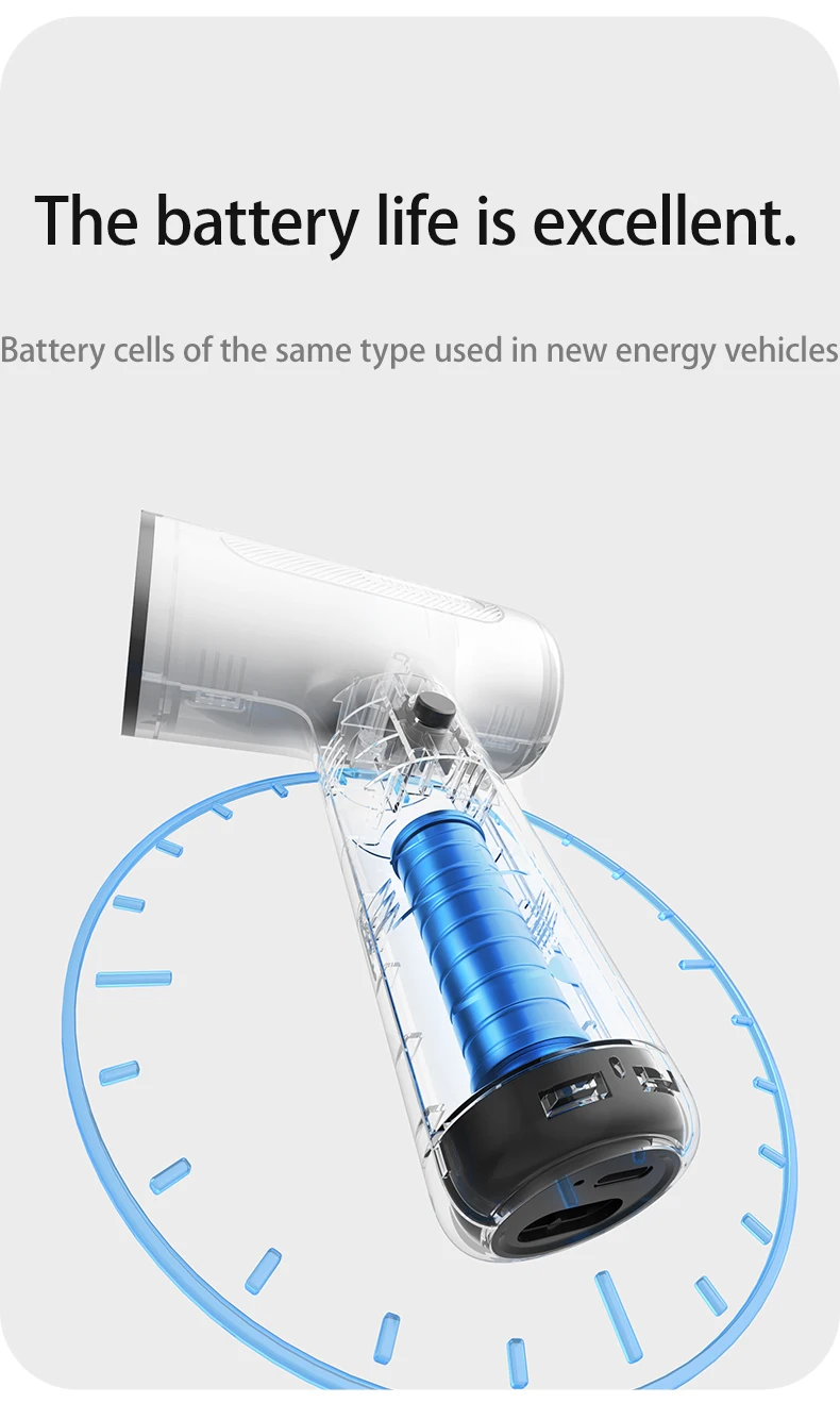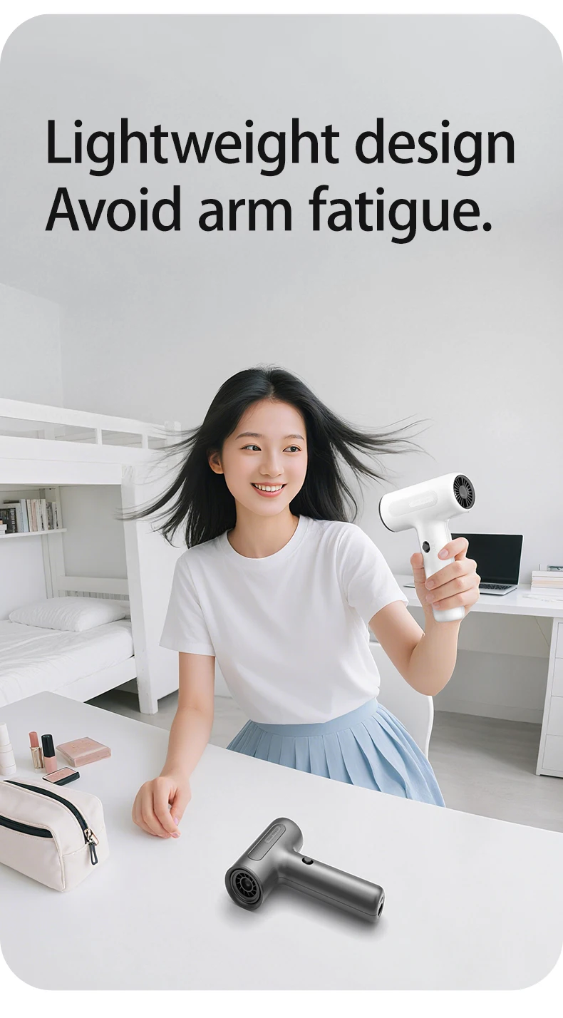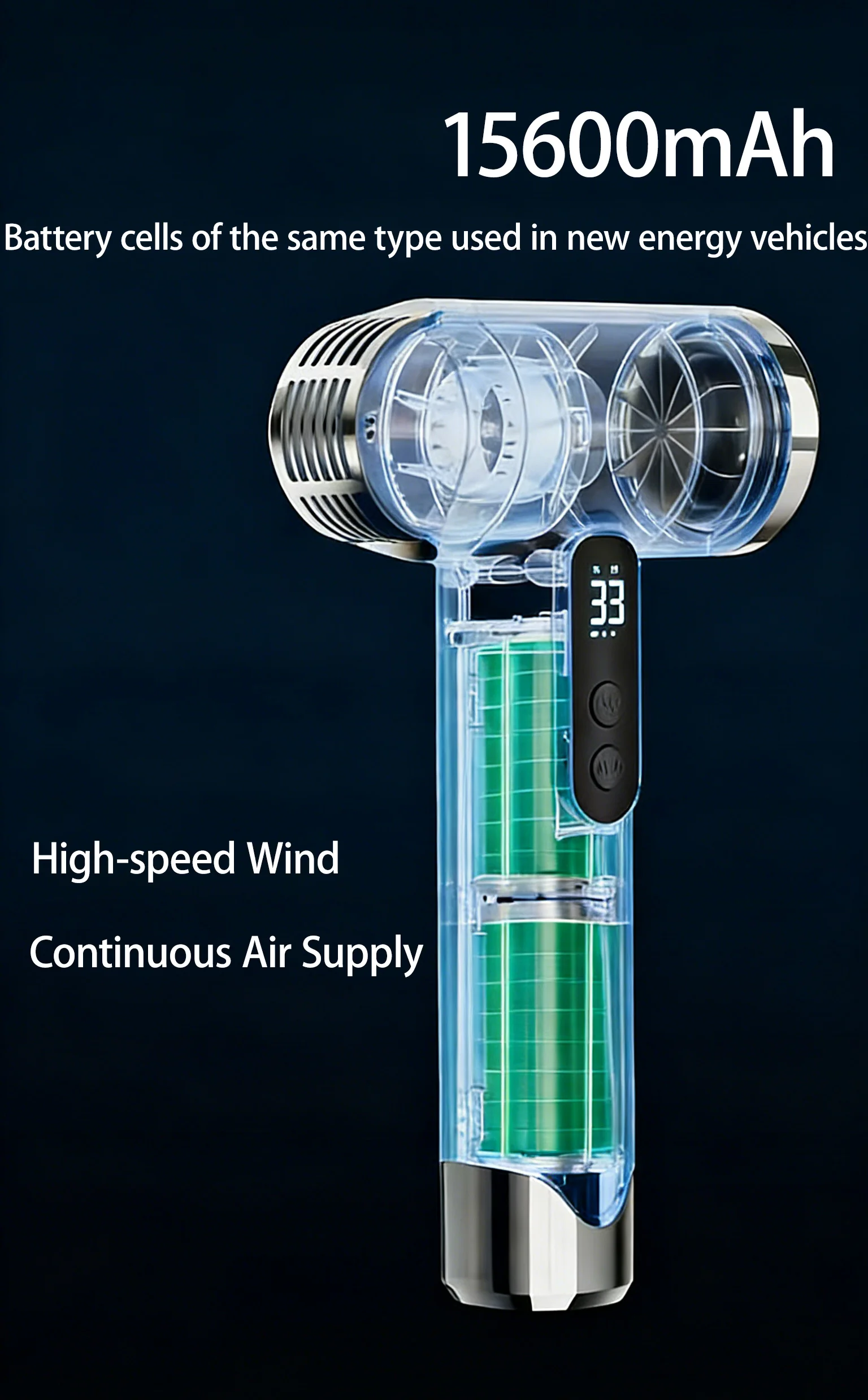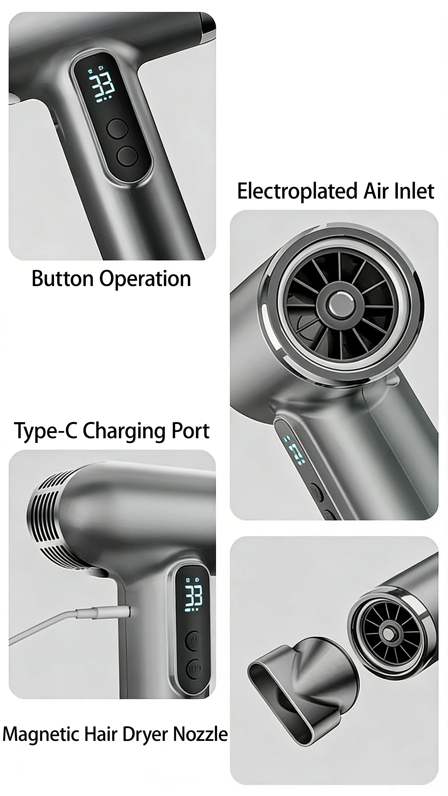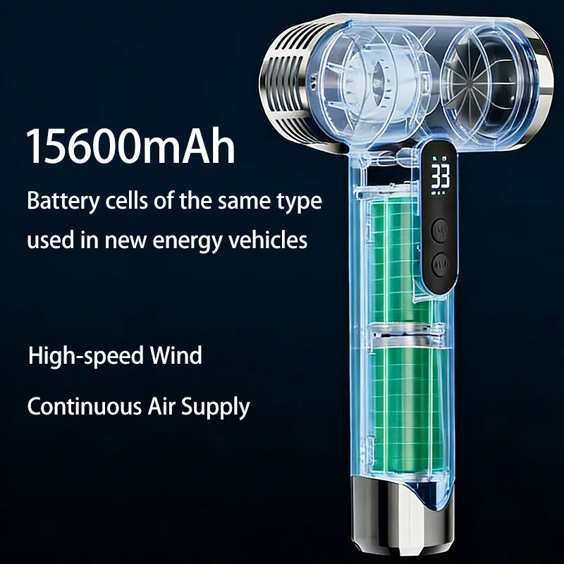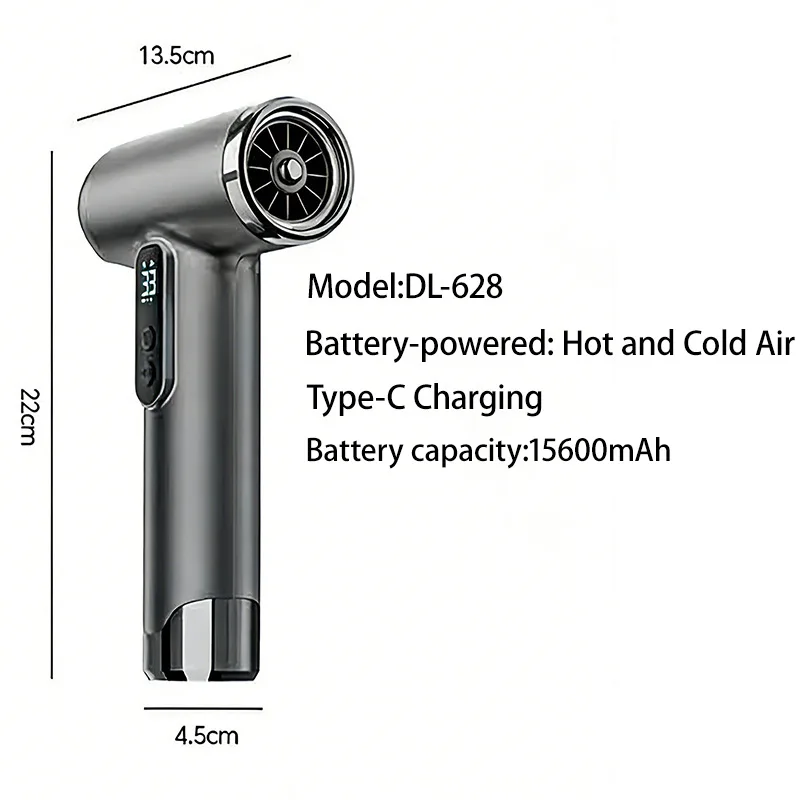 Rechargeable (Type-C charging port) with 15600mAh new energy vehicle-grade battery cells, delivering continuous high-speed wind supply for on-the-go use (perfect for travel, hotel stays, or bathroom with no outlet nearby).