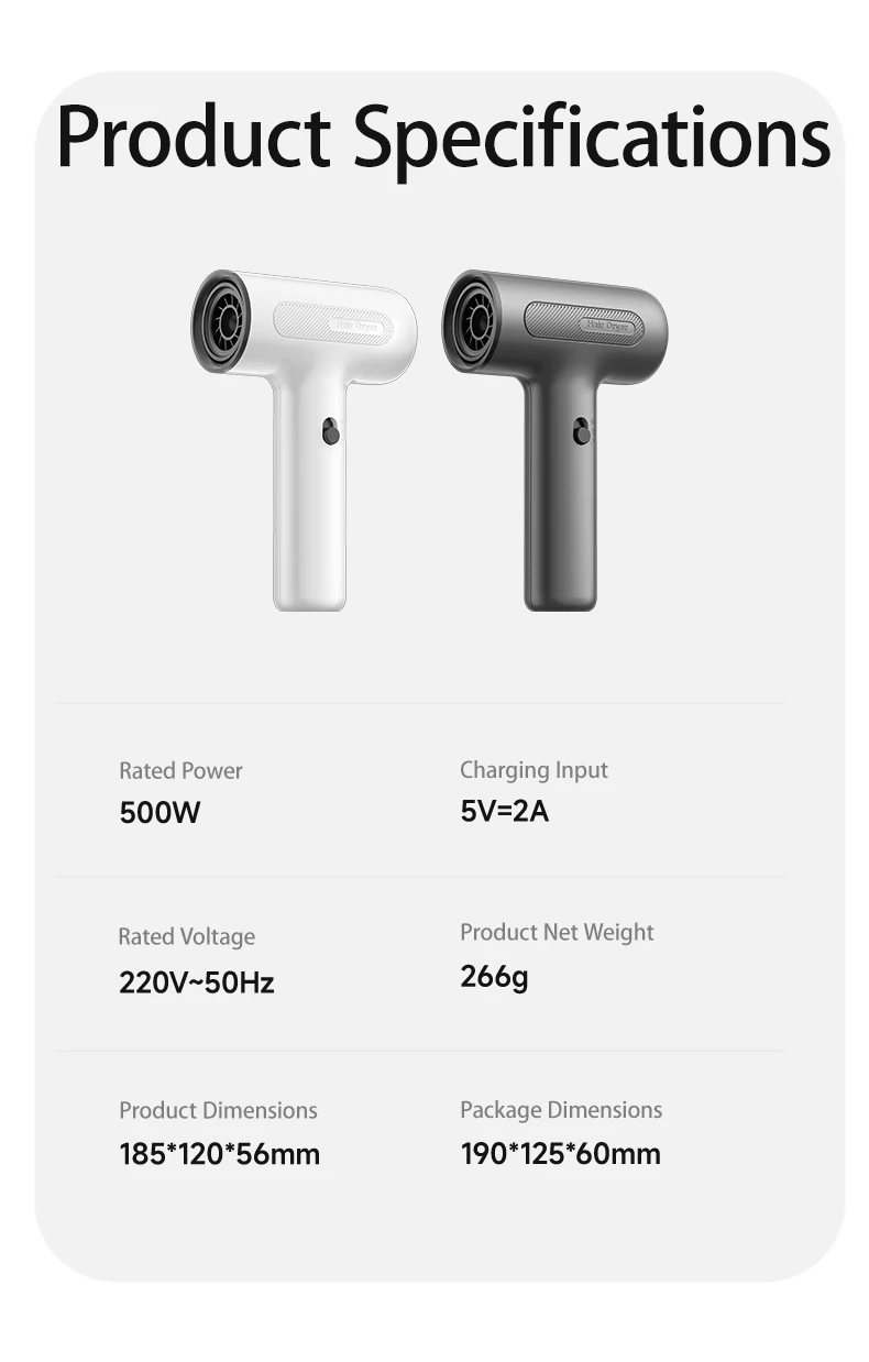 voltage, 500g weight — a versatile cordless hair dryer for home, travel, and professional styling.
