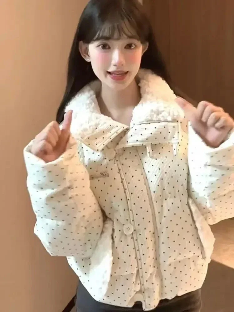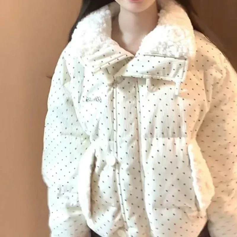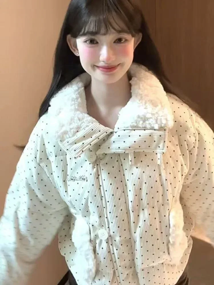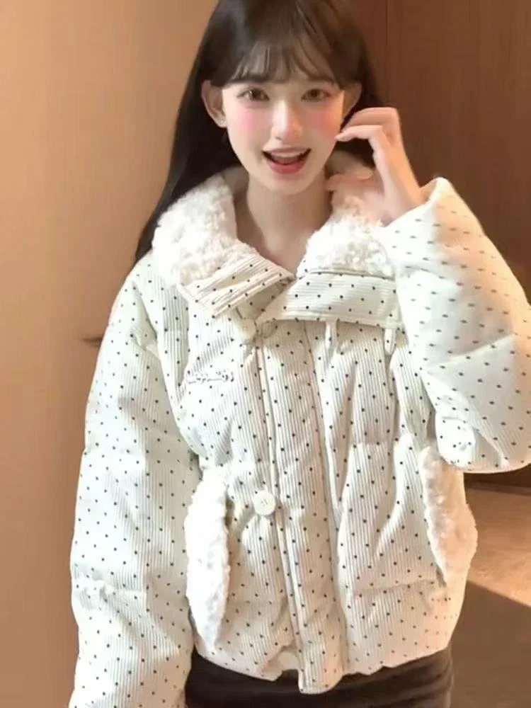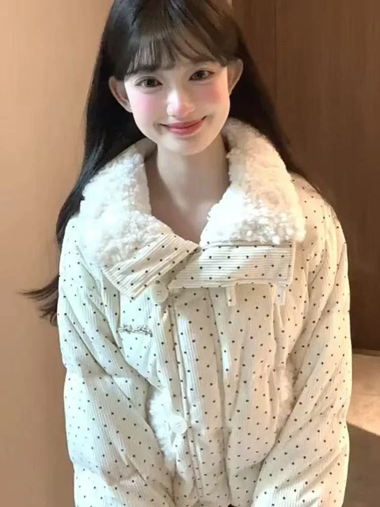 / Sweet Polka Dot Parkas Women Winter Loose Casual Thicken Button Patchwork Puffy Coats Korean Fashion Fur Collar Female Outwear