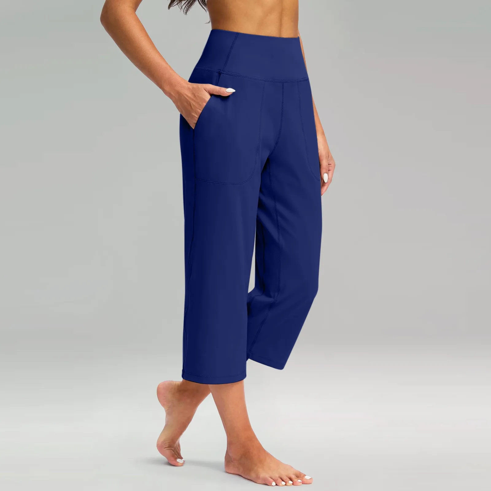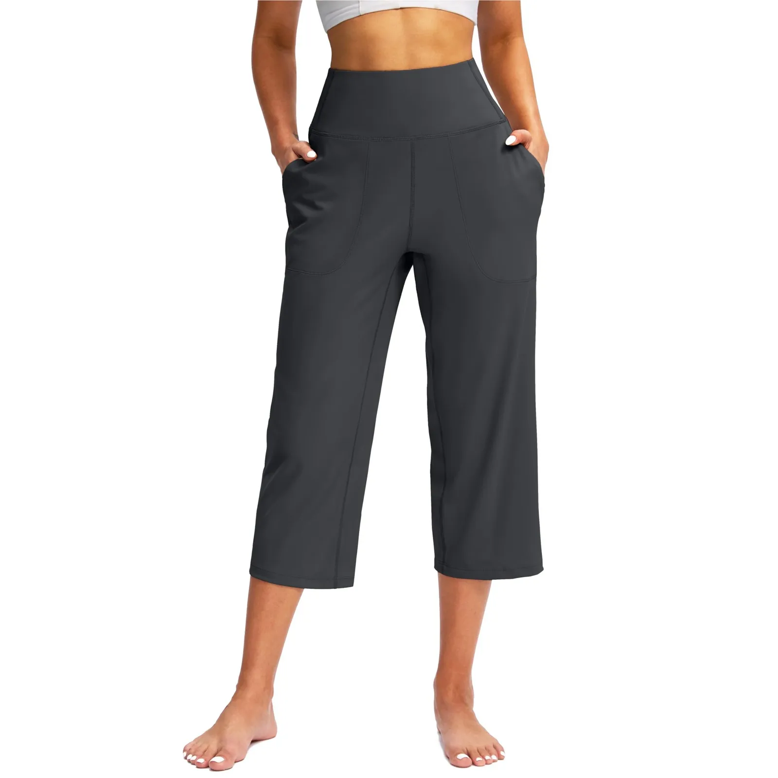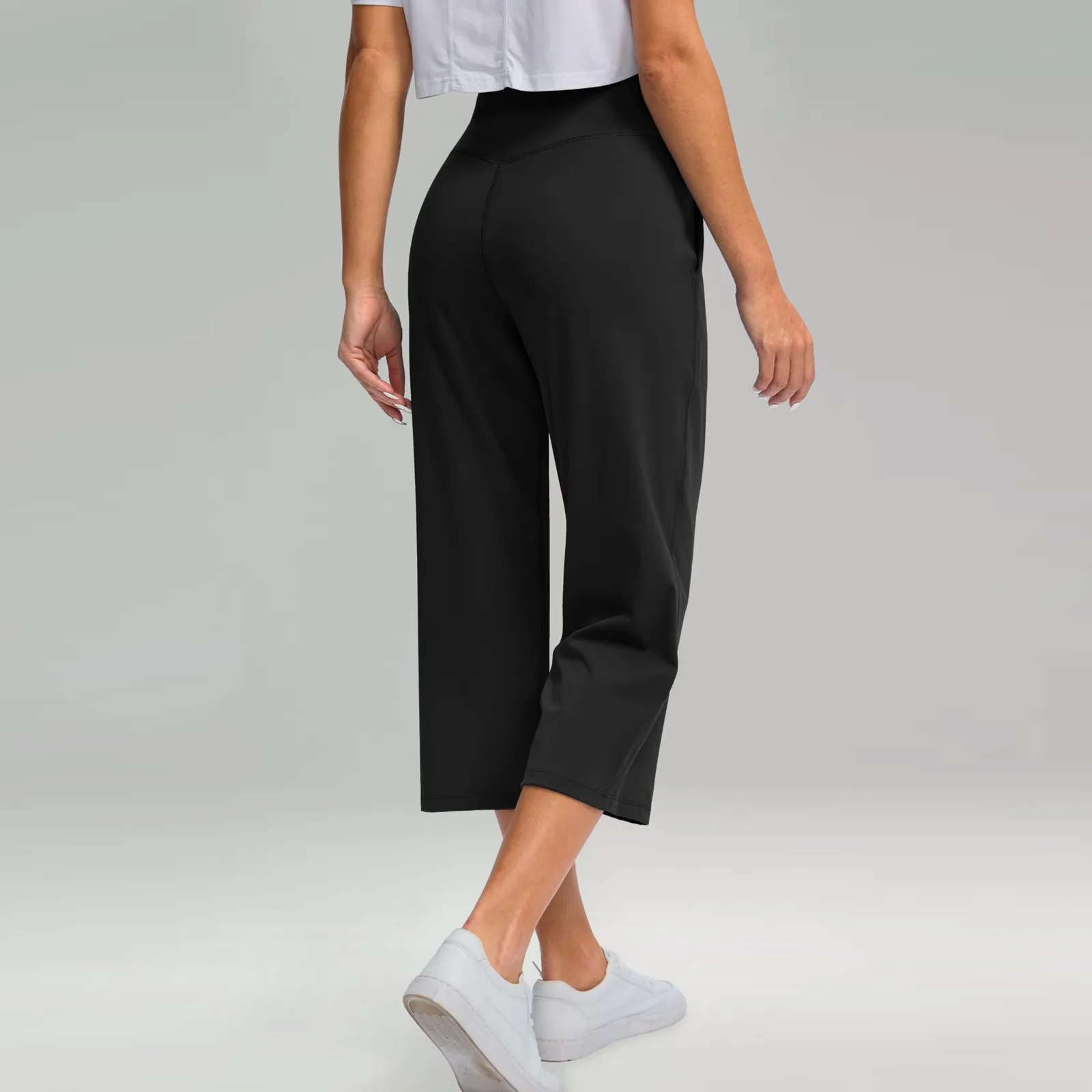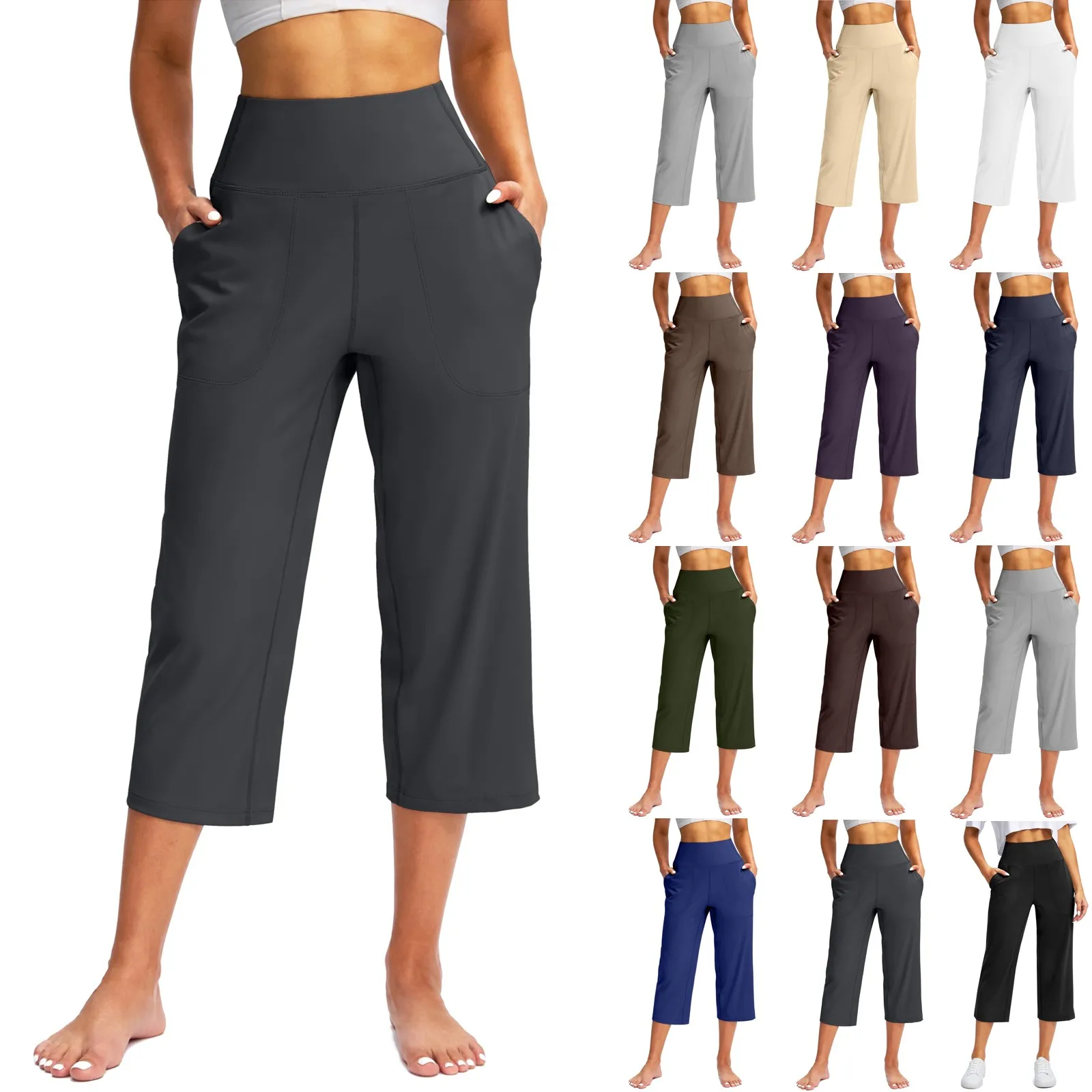 Women Elastic High Waist 3/4 Pant Casual Active Fit Wide Capris Leg Pants Trousers With Pockets